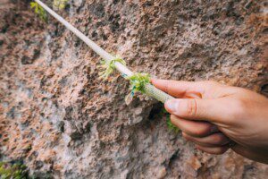 The hand of a climber or climber holds a frayed rope, danger on the rock concept
